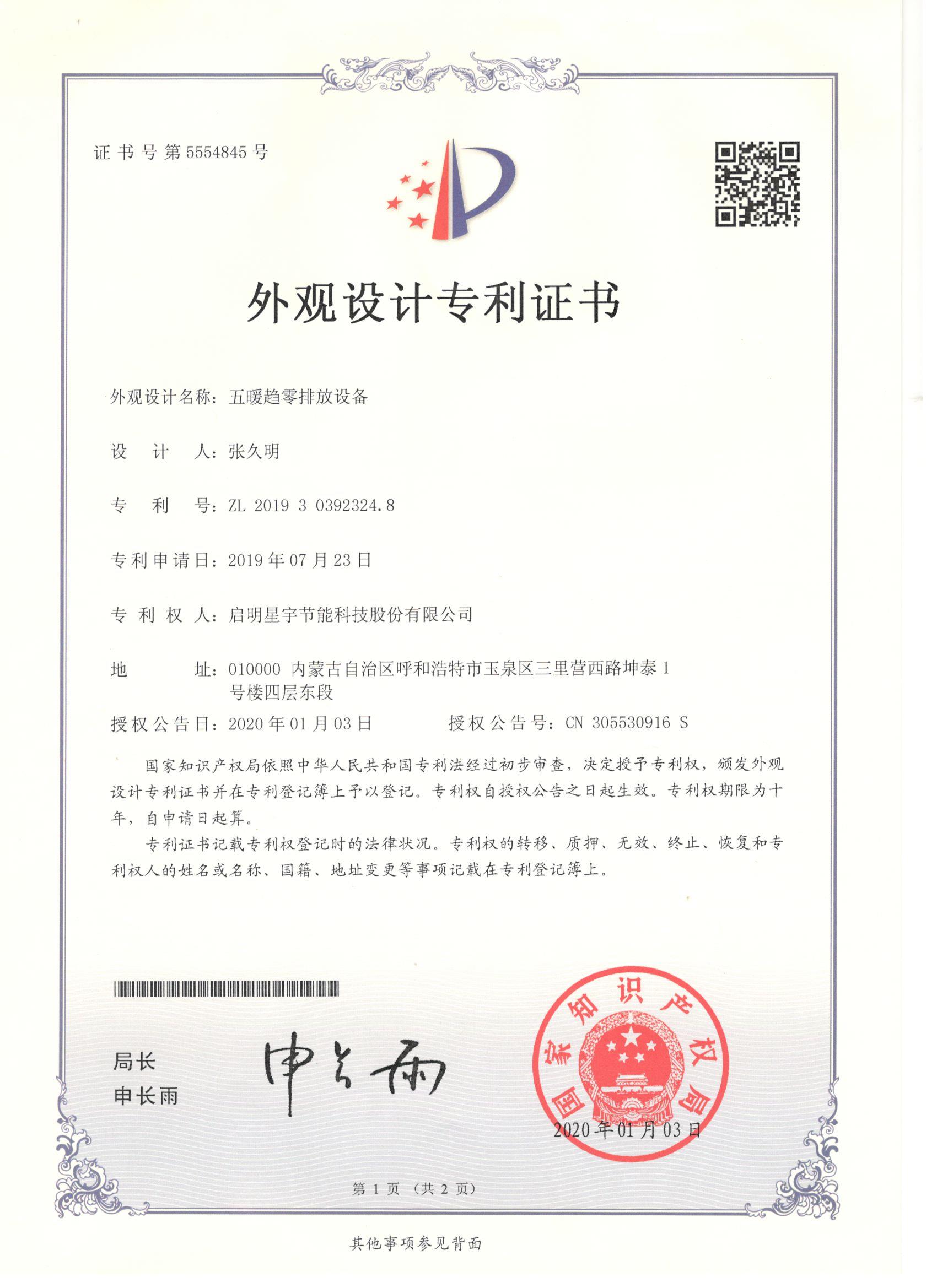 五暖趨零排放設(shè)備外觀設(shè)計(jì)專利證書